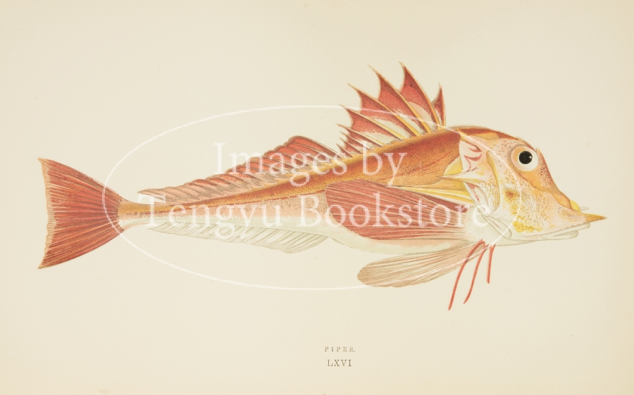 19世紀イギリスの博物学者ジョナサン・クーチ(1789–1870)の主著「ブリテン諸島魚類誌」の挿絵。グレート・ブリテン島やアイルランド島をはじめ、大小様々な島で構成されたブリテン諸島に生息する魚類を精緻な色刷木口木版画で表現した博物図鑑の名作です。
