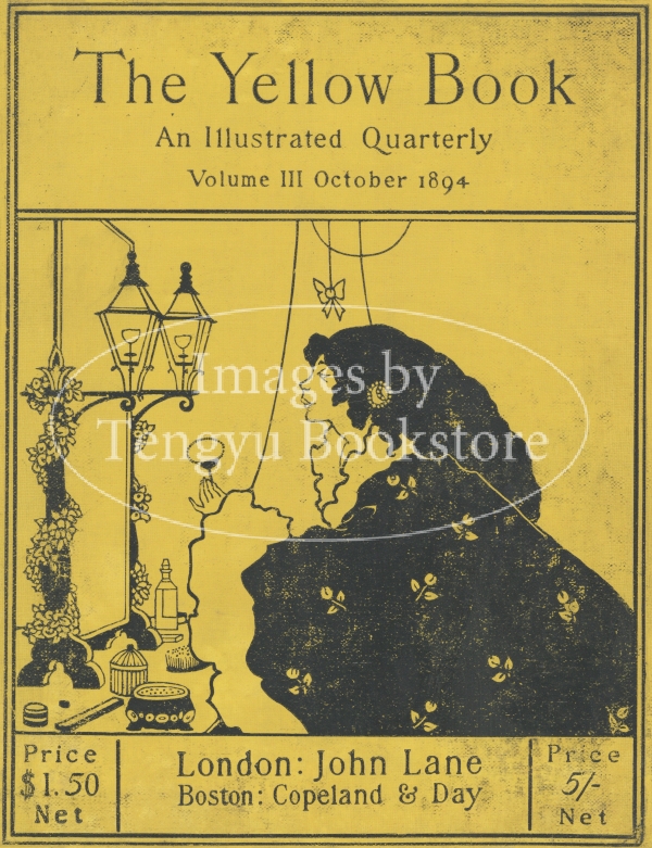 19世紀イギリスの芸術雑誌「イエロー・ブック」第3号の表紙。ヴィクトリア朝後期イギリスを代表する画家オーブリー・ビアズリー(1872-1898)が創設に加わったことで知られる本書は、世紀末イギリスにおけるデカダンス芸術運動の象徴として重要な雑誌。その名の通り黄色いクロス表紙に、黒を利かせたイラストを配した装丁が特徴的で、とりわけビアズリーが表紙画や本文イラストを描いた初期の号(Vol.1-4)は、今なお高い人気を誇ります。