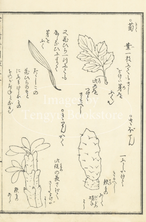 江戸時代後期に刊行された園芸指南書「金生樹譜 別録」からの一枚。江戸後期から明治にかけての故実研究家 長生舎主人(栗原信充:1794-1870)による本書は、当時流行した万年青(おもと)やセッコク、松葉蘭などをはじめ、様々な園芸植物の手入れから道具の種類までを絵入りで解説したもの。