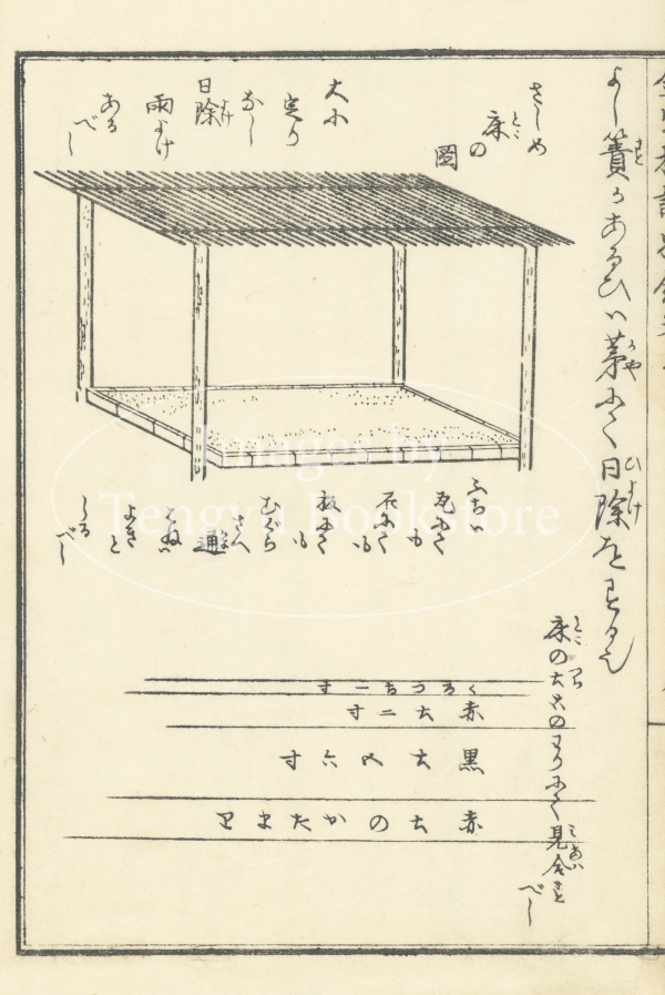 江戸時代後期に刊行された園芸指南書「金生樹譜 別録」からの一枚。江戸後期から明治にかけての故実研究家 長生舎主人(栗原信充:1794-1870)による本書は、当時流行した万年青(おもと)やセッコク、松葉蘭などをはじめ、様々な園芸植物の手入れから道具の種類までを絵入りで解説したもの。