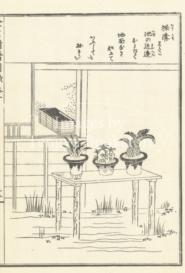 江戸時代後期に刊行された園芸指南書「金生樹譜 別録」からの一枚。江戸後期から明治にかけての故実研究家 長生舎主人(栗原信充:1794-1870)による本書は、当時流行した万年青(おもと)やセッコク、松葉蘭などをはじめ、様々な園芸植物の手入れから道具の種類までを絵入りで解説したもの。