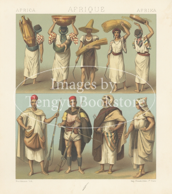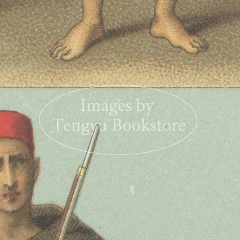 多色刷石版によってカラー印刷された、世界の歴史的衣装や民族衣装の図は、資料的な価値はもちろん、美術的にも評価の高い貴重なイラストです。