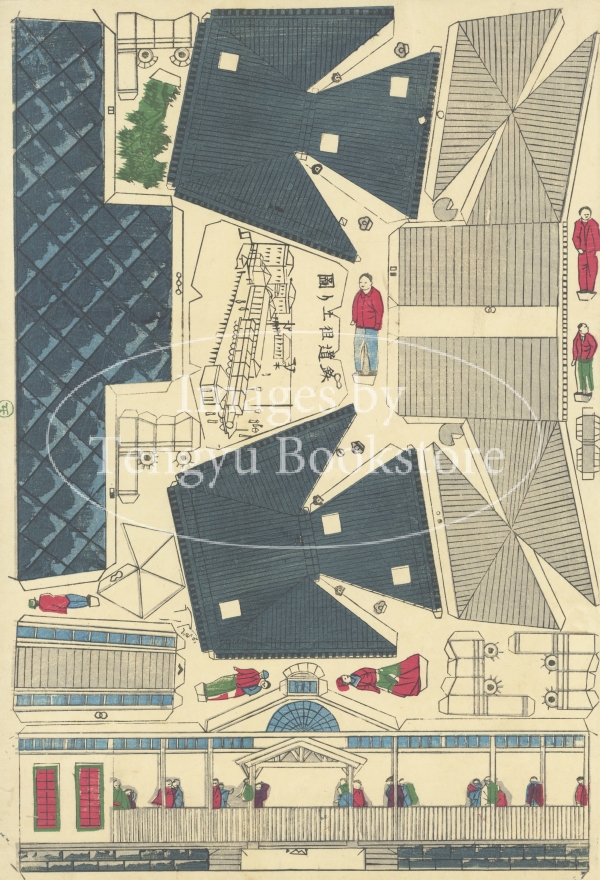 幕末~明治時代に活躍した浮世絵師 梅堂国政(三代目 歌川国貞/四代目 歌川国政:1848-1920)による鉄道のおもちゃ絵。本作は、絵柄を切り抜いてジオラマを組み立てる立版古(たてばんこ)と呼ばれるもの。(※ 7枚中の6枚目)