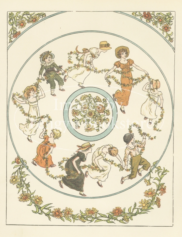 19世紀イギリスを代表する絵本作家ケイト・グリーナウェイ(1846-1901)の代表作「マリーゴールド・ガーデン」の挿絵。ケイト・グリーナウェイによる詩とイラストを色鮮やかなカラー木版で印刷した本書は、刊行当初から高い人気を博し、今なお世界で愛され続ける絵本の古典です。