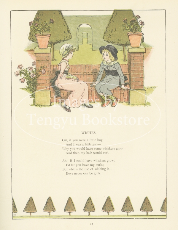 19世紀イギリスを代表する絵本作家ケイト・グリーナウェイ(1846-1901)の代表作「マリーゴールド・ガーデン」の挿絵。ケイト・グリーナウェイによる詩とイラストを色鮮やかなカラー木版で印刷した本書は、刊行当初から高い人気を博し、今なお世界で愛され続ける絵本の古典です。