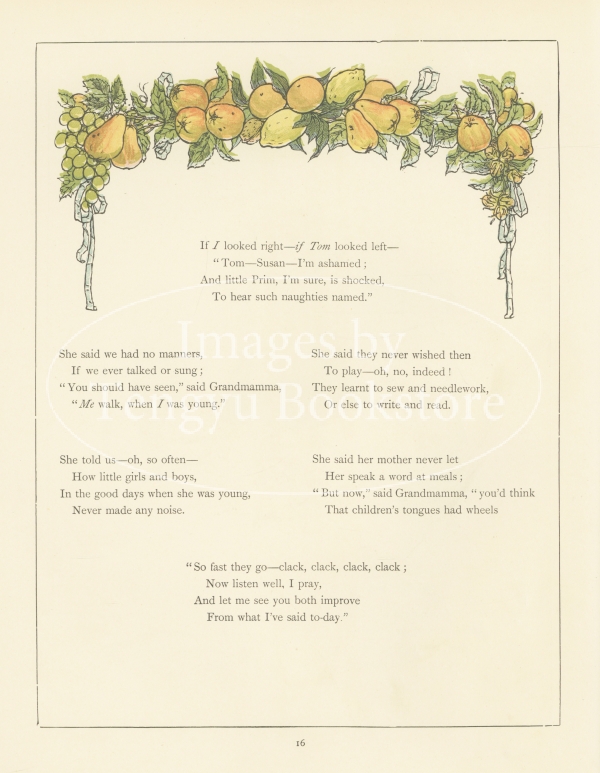 19世紀イギリスを代表する絵本作家ケイト・グリーナウェイ(1846-1901)の代表作「マリーゴールド・ガーデン」の挿絵。ケイト・グリーナウェイによる詩とイラストを色鮮やかなカラー木版で印刷した本書は、刊行当初から高い人気を博し、今なお世界で愛され続ける絵本の古典です。