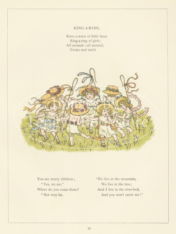 19世紀イギリスを代表する絵本作家ケイト・グリーナウェイ(1846-1901)の代表作「マリーゴールド・ガーデン」の挿絵。ケイト・グリーナウェイによる詩とイラストを色鮮やかなカラー木版で印刷した本書は、刊行当初から高い人気を博し、今なお世界で愛され続ける絵本の古典です。