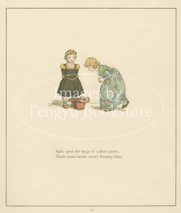 19世紀イギリスを代表する絵本作家ケイト・グリーナウェイ(1846-1901)の絵本「ハーメルンの笛吹き男」の挿絵。詩人ロバート・ブラウニングがドイツの伝承を元に執筆した詩作品にケイト・グリーナウェイ原画による色鮮やかな色刷木版画を付けた本書は、ケイト・グリーナウェイの最高傑作とも呼ばれる名作です。