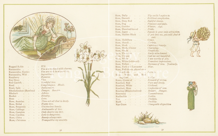 19世紀イギリスを代表する絵本作家ケイト・グリーナウェイ(1846-1901)の代表作のひとつ「花言葉」の挿絵。多くの花に付けられた象徴的な意味合いを持つ言葉「花言葉」を、ケイト・グリーナウェイによる植物画と少女たちのイラストとともに紹介した画文集。
