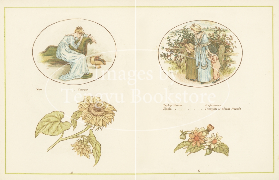 19世紀イギリスを代表する絵本作家ケイト・グリーナウェイ(1846-1901)の代表作のひとつ「花言葉」の挿絵。多くの花に付けられた象徴的な意味合いを持つ言葉「花言葉」を、ケイト・グリーナウェイによる植物画と少女たちのイラストとともに紹介した画文集。