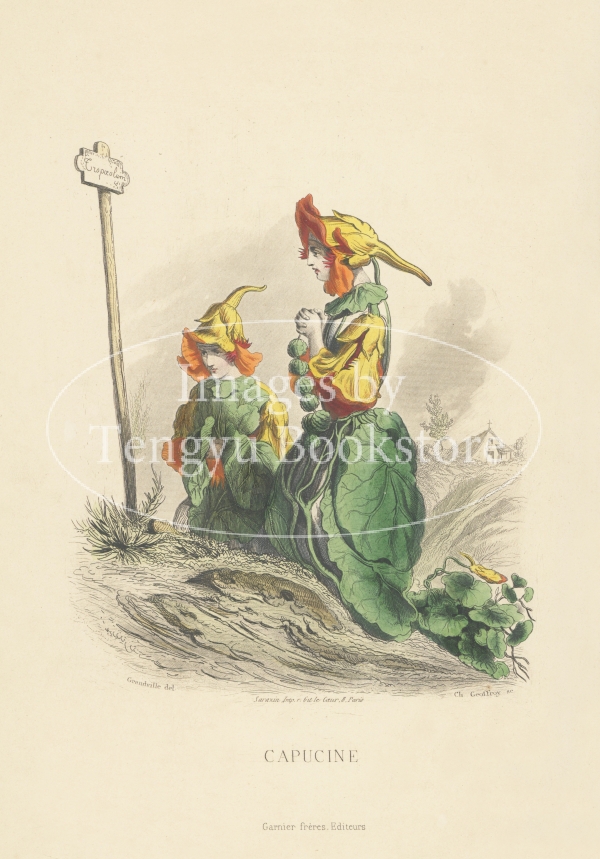 擬人化動物のイラストを得意としたグランヴィルが最晩年に取り組んだ本作は、「花」を題材にした連作。擬人化した姿を与えられた花の精たちの奇妙で愛らしい物語を描いた本書は、刊行当時高い人気を博した、グランヴィルの代表作の一つです。