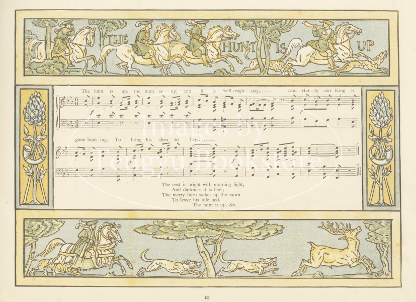19世紀末イギリスの絵本画家ウォルター・クレイン(1845-1915)の代表作の一つ「パンの笛」(初版)の1ページ。イギリスの伝統歌謡曲の歌詞と楽譜に、ウォルター・クレインが挿絵と装飾枠を描いた美しい絵入楽譜集。