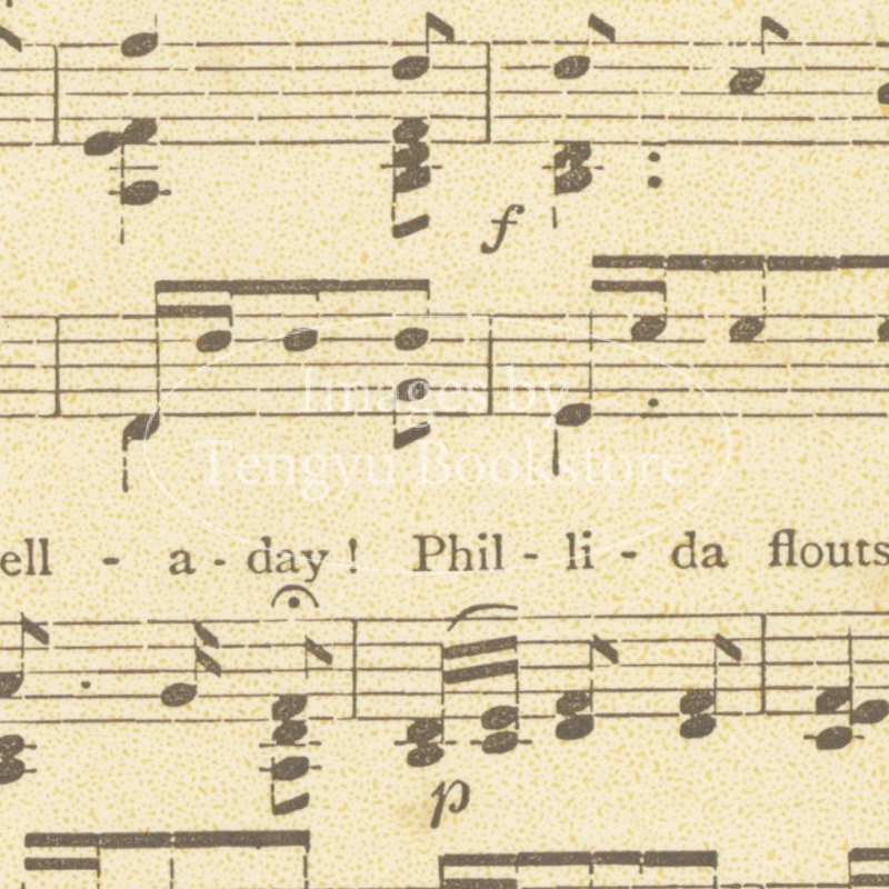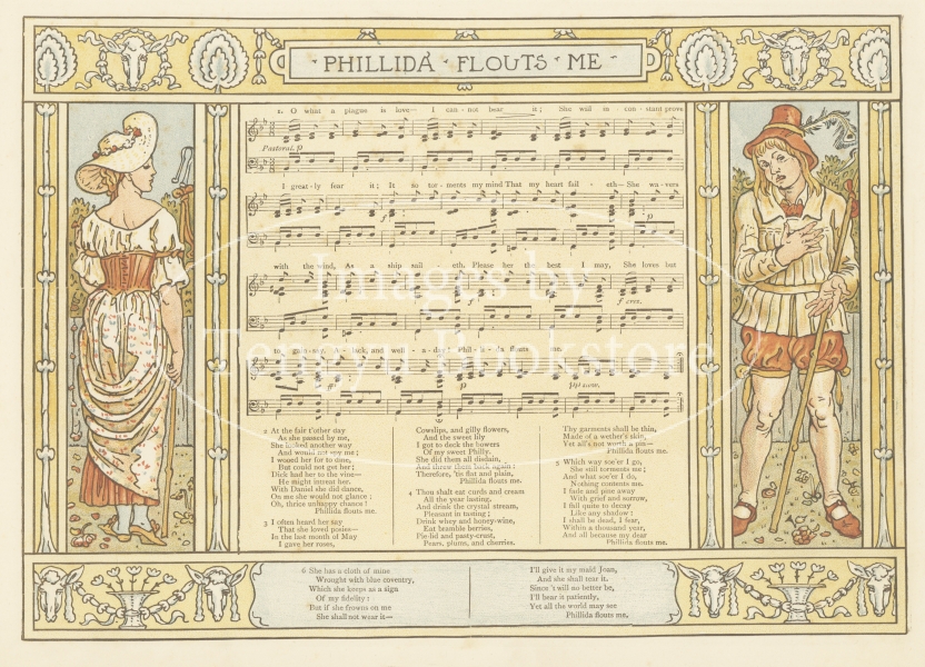 19世紀末イギリスの絵本画家ウォルター・クレイン(1845-1915)の代表作の一つ「パンの笛」(初版)の1ページ。イギリスの伝統歌謡曲の歌詞と楽譜に、ウォルター・クレインが挿絵と装飾枠を描いた美しい絵入楽譜集。