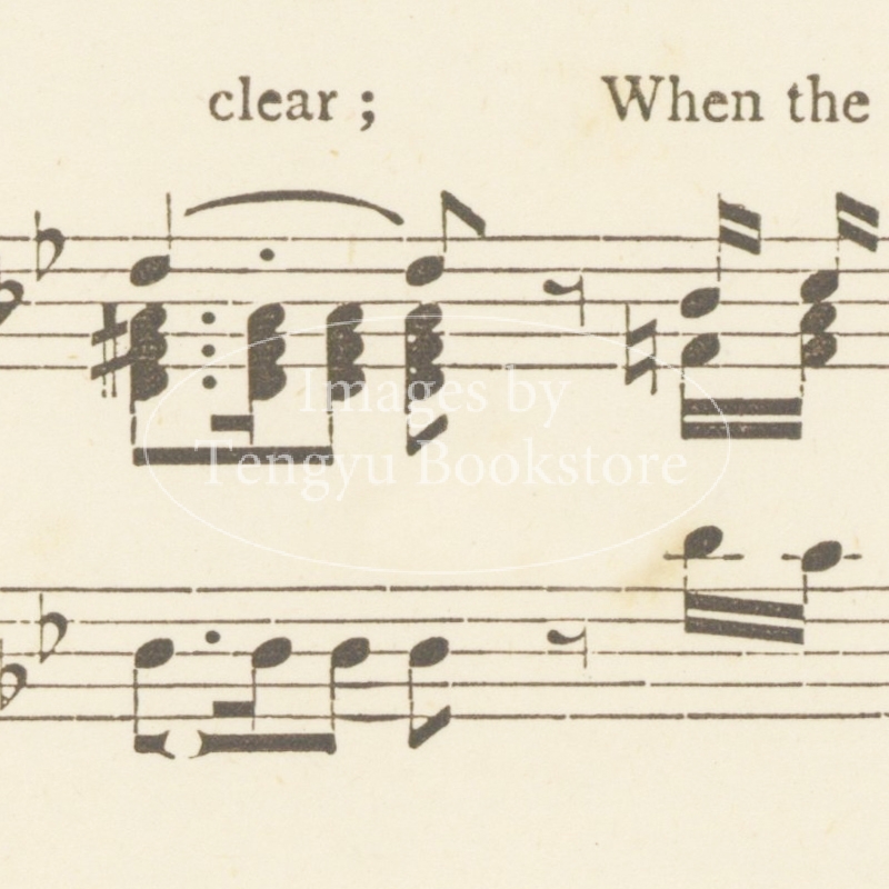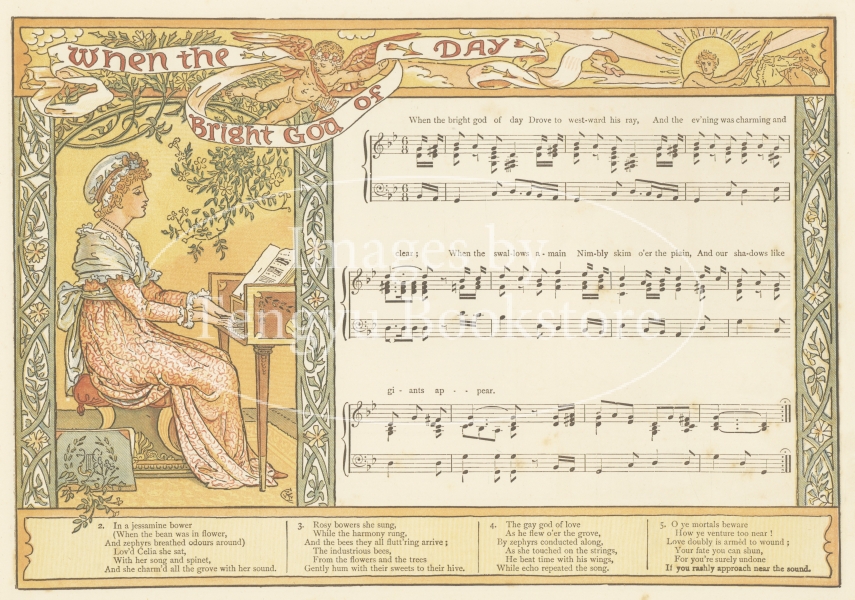 19世紀末イギリスの絵本画家ウォルター・クレイン(1845-1915)の代表作の一つ「パンの笛」(初版)の1ページ。イギリスの伝統歌謡曲の歌詞と楽譜に、ウォルター・クレインが挿絵と装飾枠を描いた美しい絵入楽譜集。