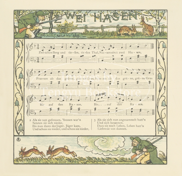 イギリスやヨーロッパ各地の伝統歌謡曲の歌詞と楽譜に、ウォルター・クレインが挿絵と装飾枠を描いた美しい絵入楽譜集。