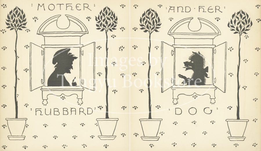 19世紀末イギリスを代表する絵本画家ウォルター・クレイン(1845-1915)の絵本「ハバードおばさん」の見返し。イギリスの伝承童謡マザーグースの一つで、ハバードおばさんと飼い犬のナンセンスなやり取りを歌ったもの。