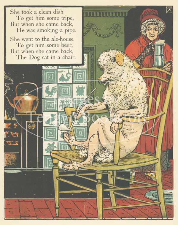 19世紀末イギリスを代表する絵本画家ウォルター・クレイン(1845-1915)の絵本「ハバードおばさん」の挿絵。イギリスの伝承童謡マザーグースの一つで、ハバードおばさんと飼い犬のナンセンスなやり取りを歌ったもの。
