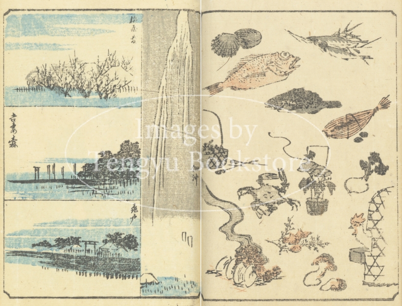 江戸時代後期の人気浮世絵師 歌川広重(1797-1858)による絵手本集「草筆画譜」より。「東海道五十三次」等の風景画シリーズで知られる広重が、風景・動植物・人物など多種多様な題材をシンプルな形で描いたイラスト集です。