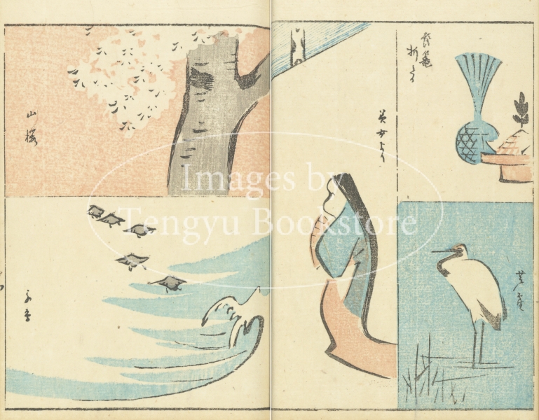 江戸時代後期の人気浮世絵師 歌川広重(1797-1858)による絵手本集「草筆画譜」より。「東海道五十三次」等の風景画シリーズで知られる広重が、風景・動植物・人物など多種多様な題材をシンプルな形で描いたイラスト集です。