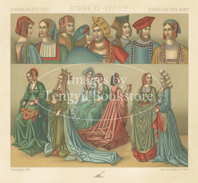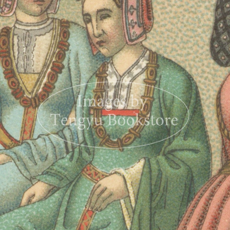多色刷石版によってカラー印刷された、世界の歴史的衣装や民族衣装の図は、資料的な価値はもちろん、美術的にも評価の高い貴重なイラストです。