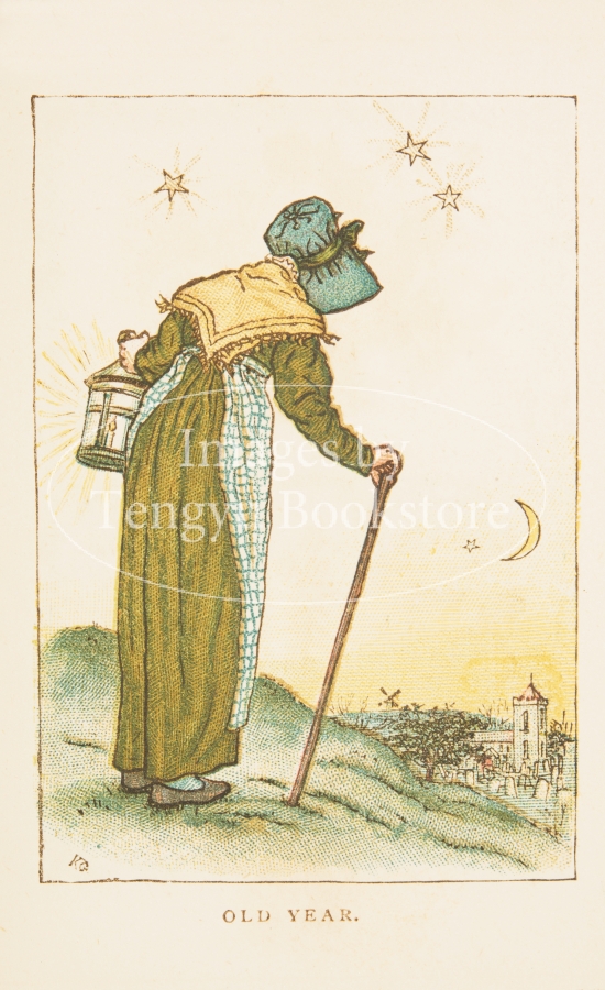 19世紀イギリスを代表する絵本作家ケイト・グリーナウェイ(1846-1901)の小型本「アルマナック(暦)1883」の挿絵。1年12ヵ月のカレンダーにグリーナウェイのイラストを添えた、当時高い人気を博した暦本。