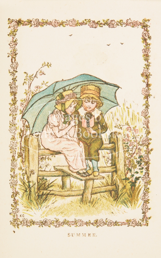 19世紀イギリスを代表する絵本作家ケイト・グリーナウェイ(1846-1901)の小型本「アルマナック(暦)1883」の挿絵。1年12ヵ月のカレンダーにグリーナウェイのイラストを添えた、当時高い人気を博した暦本。
