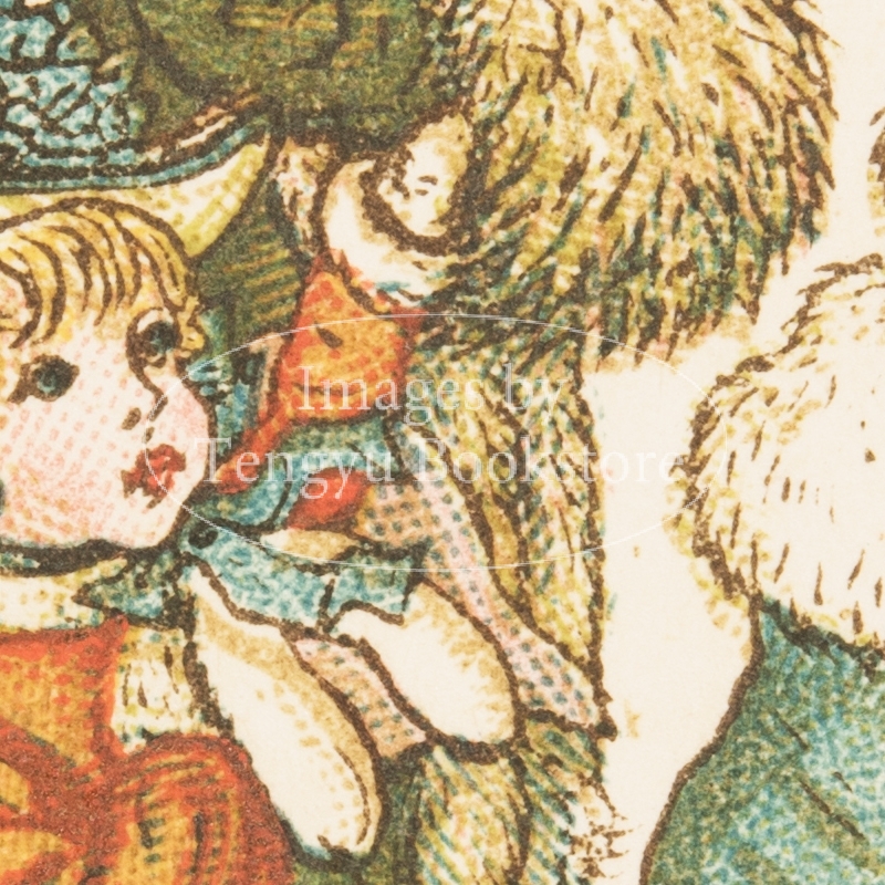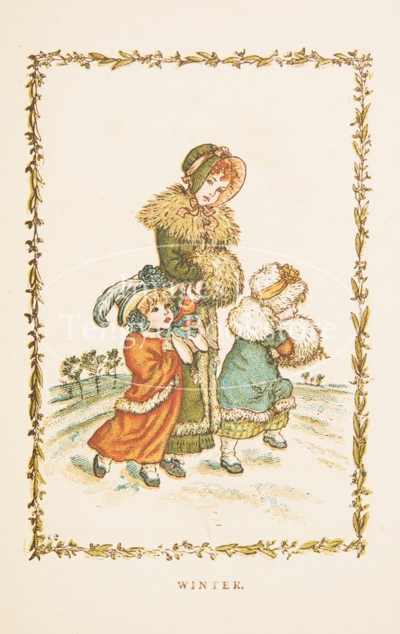 19世紀イギリスを代表する絵本作家ケイト・グリーナウェイ(1846-1901)の小型本「アルマナック(暦)1883」の挿絵。1年12ヵ月のカレンダーにグリーナウェイのイラストを添えた、当時高い人気を博した暦本。