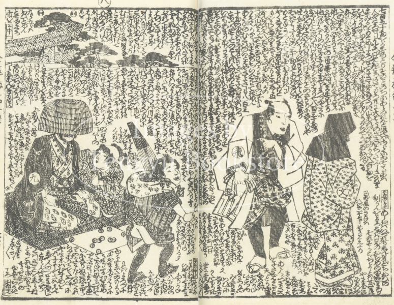 中国四大奇書の一つ「金瓶梅」を翻案した絵入草双紙である本作の挿絵は、浮世絵師としても知られる歌川国安(1794-1832)と三代目歌川豊国(1786-1865)によるもの。