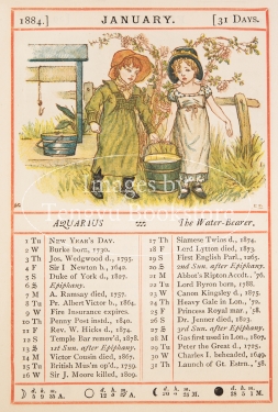 19世紀イギリスを代表する絵本作家ケイト・グリーナウェイ(1846-1901)の小型本「アルマナック(暦)1884」の挿絵。1年12ヵ月のカレンダーにグリーナウェイのイラストを添えた、当時高い人気を博した暦本。