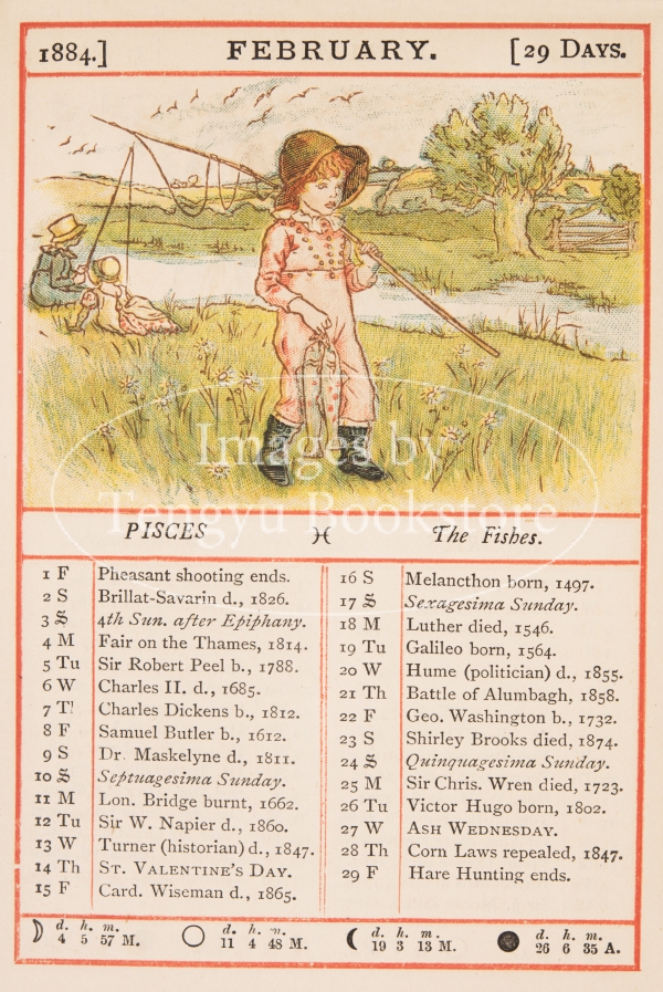 19世紀イギリスを代表する絵本作家ケイト・グリーナウェイ(1846-1901)の小型本「アルマナック(暦)1884」の挿絵。1年12ヵ月のカレンダーにグリーナウェイのイラストを添えた、当時高い人気を博した暦本。
