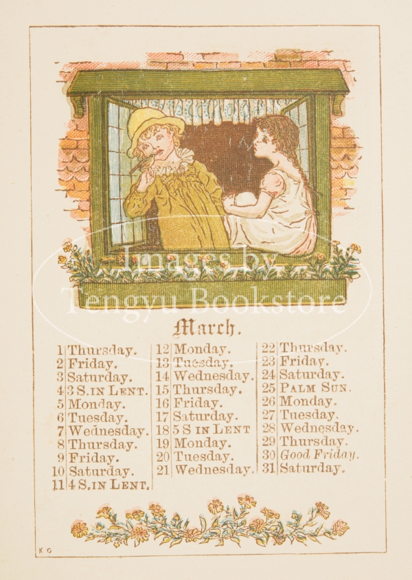 19世紀イギリスを代表する絵本作家ケイト・グリーナウェイ(1846-1901)の小型本「アルマナック(暦)1888」の挿絵。1年12ヵ月のカレンダーにグリーナウェイのイラストを添えた、当時高い人気を博した暦本。