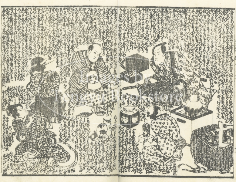 中国四大奇書の一つ「金瓶梅」を翻案した絵入草双紙である本作の挿絵は、浮世絵師としても知られる歌川国安(1794-1832)と三代目歌川豊国(1786-1865)によるもの。