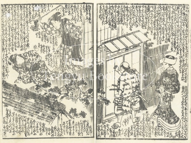中国四大奇書の一つ「金瓶梅」を翻案した絵入草双紙である本作の挿絵は、浮世絵師としても知られる歌川国安(1794-1832)と歌川国貞(三代目歌川豊国/1786-1865)によるもの。