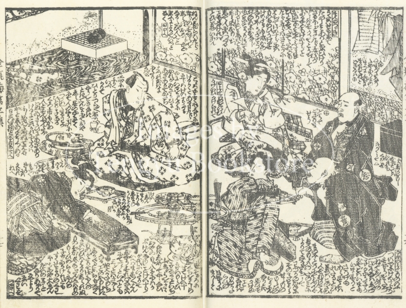 中国四大奇書の一つ「金瓶梅」を翻案した絵入草双紙である本作の挿絵は、浮世絵師としても知られる歌川国安(1794-1832)と歌川国貞(三代目歌川豊国/1786-1865)によるもの。