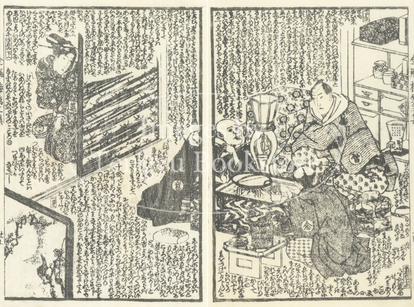 中国四大奇書の一つ「金瓶梅」を翻案した絵入草双紙である本作の挿絵は、浮世絵師としても知られる歌川国安(1794-1832)と歌川国貞(三代目歌川豊国/1786-1865)によるもの。