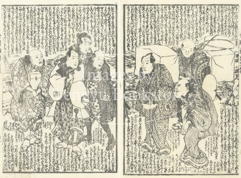 中国四大奇書の一つ「金瓶梅」を翻案した絵入草双紙である本作の挿絵は、浮世絵師としても知られる歌川国安(1794-1832)と歌川国貞(三代目歌川豊国/1786-1865)によるもの。