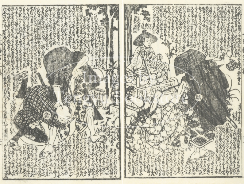 中国四大奇書の一つ「金瓶梅」を翻案した絵入草双紙である本作の挿絵は、浮世絵師としても知られる歌川国安(1794-1832)と歌川国貞(三代目歌川豊国/1786-1865)によるもの。