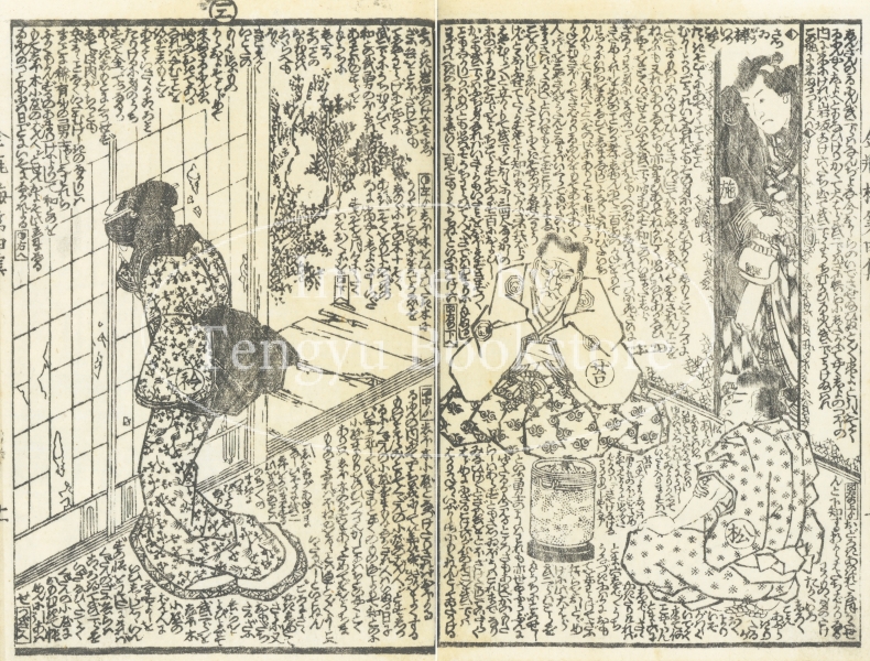 中国四大奇書の一つ「金瓶梅」を翻案した絵入草双紙である本作の挿絵は、浮世絵師としても知られる歌川国安(1794-1832)と歌川国貞(三代目歌川豊国/1786-1865)によるもの。