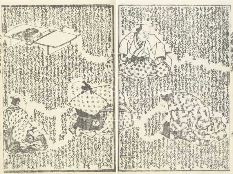 中国四大奇書の一つ「金瓶梅」を翻案した絵入草双紙である本作の挿絵は、浮世絵師としても知られる歌川国安(1794-1832)と歌川国貞(三代目歌川豊国/1786-1865)によるもの。