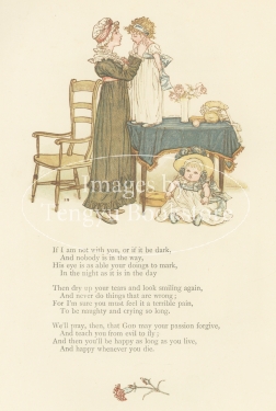 19世紀イギリスを代表する絵本作家ケイト・グリーナウェイ(1846-1901)の挿絵本「小さなアンの詩の本」の挿絵。童謡「きらきら星」の作者でもある詩人ジェーン・テイラーとその母アン・テイラーの作品から選んだ詩に、グリーナウェイのイラストを添えた挿絵付詩集。