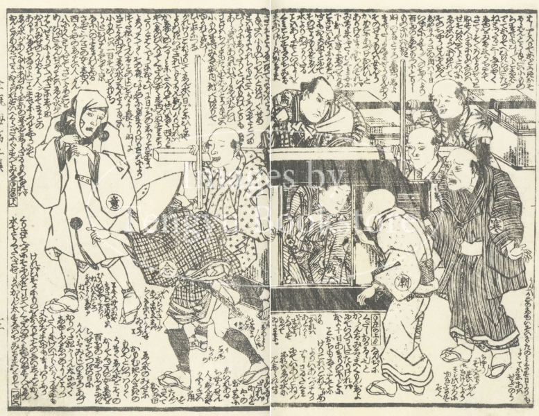 中国四大奇書の一つ「金瓶梅」を翻案した絵入草双紙である本作の挿絵は、浮世絵師としても知られる歌川国安(1794-1832)と歌川国貞(三代目歌川豊国/1786-1865)によるもの。