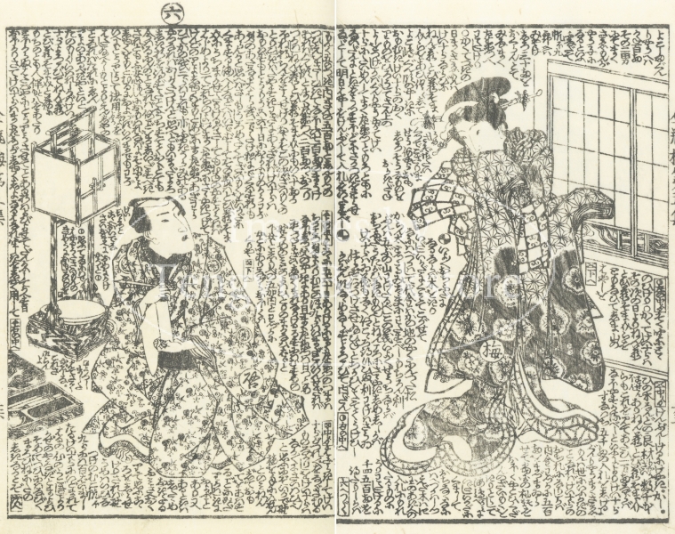 中国四大奇書の一つ「金瓶梅」を翻案した絵入草双紙である本作の挿絵は、浮世絵師としても知られる歌川国安(1794-1832)と歌川国貞(三代目歌川豊国/1786-1865)によるもの。