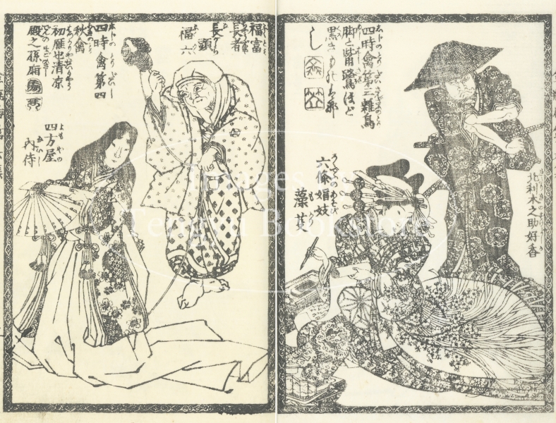 中国四大奇書の一つ「金瓶梅」を翻案した絵入草双紙である本作の挿絵は、浮世絵師としても知られる歌川国安(1794-1832)と歌川国貞(三代目歌川豊国/1786-1865)によるもの。