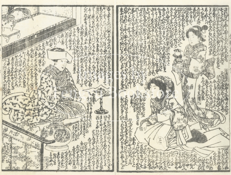 中国四大奇書の一つ「金瓶梅」を翻案した絵入草双紙である本作の挿絵は、浮世絵師としても知られる歌川国安(1794-1832)と歌川国貞(三代目歌川豊国/1786-1865)によるもの。