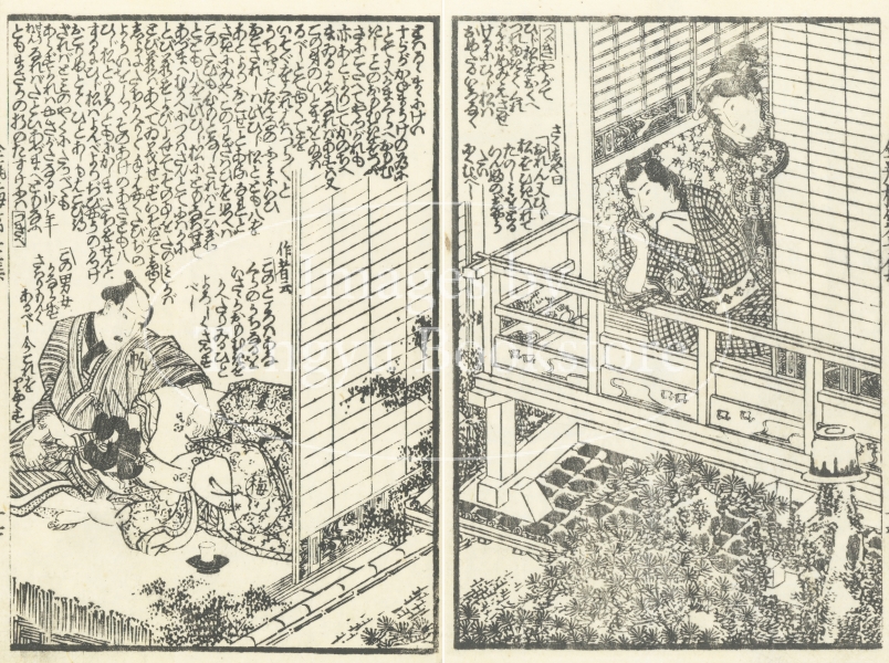 中国四大奇書の一つ「金瓶梅」を翻案した絵入草双紙である本作の挿絵は、浮世絵師としても知られる歌川国安(1794-1832)と歌川国貞(三代目歌川豊国/1786-1865)によるもの。