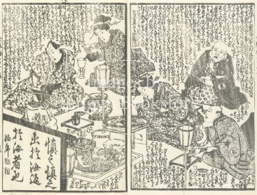 中国四大奇書の一つ「金瓶梅」を翻案した絵入草双紙である本作の挿絵は、浮世絵師としても知られる歌川国安(1794-1832)と歌川国貞(三代目歌川豊国/1786-1865)によるもの。