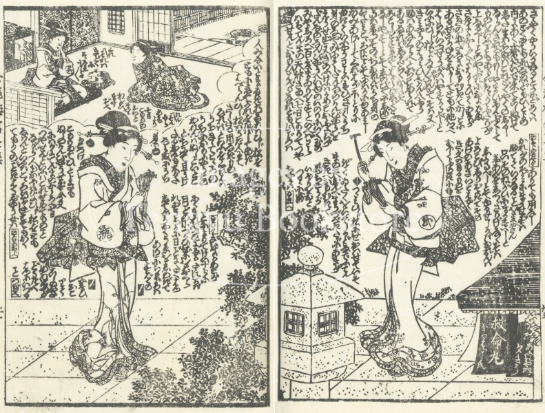 中国四大奇書の一つ「金瓶梅」を翻案した絵入草双紙である本作の挿絵は、浮世絵師としても知られる歌川国安(1794-1832)と歌川国貞(三代目歌川豊国/1786-1865)によるもの。