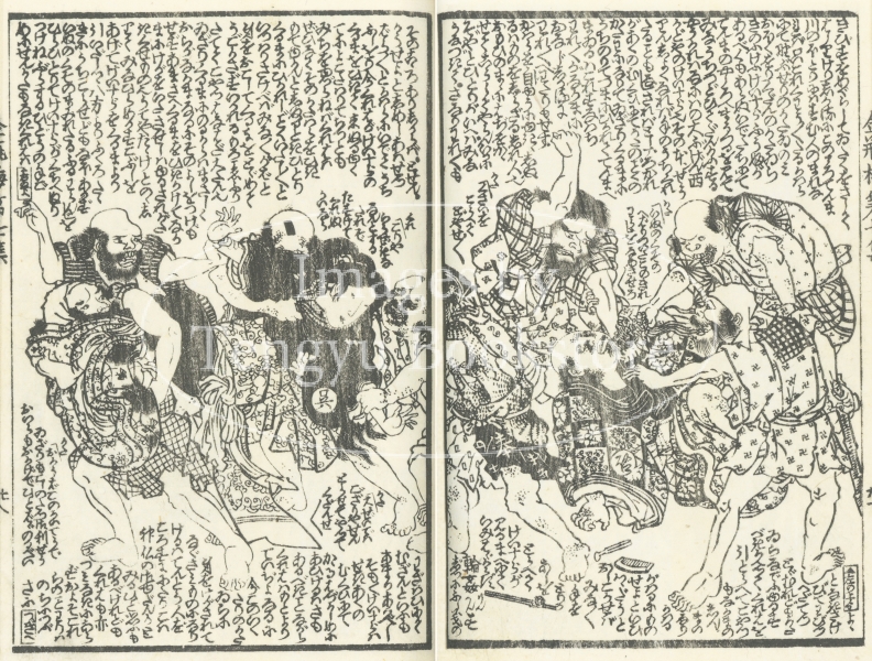 中国四大奇書の一つ「金瓶梅」を翻案した絵入草双紙である本作の挿絵は、浮世絵師としても知られる歌川国安(1794-1832)と歌川国貞(三代目歌川豊国/1786-1865)によるもの。