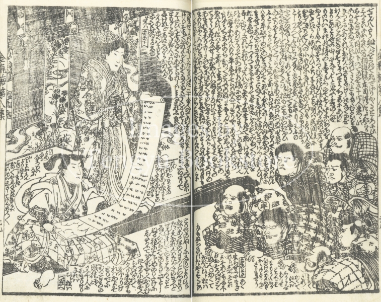 中国四大奇書の一つ「金瓶梅」を翻案した絵入草双紙である本作の挿絵は、浮世絵師としても知られる歌川国安(1794-1832)と歌川国貞(三代目歌川豊国/1786-1865)によるもの。