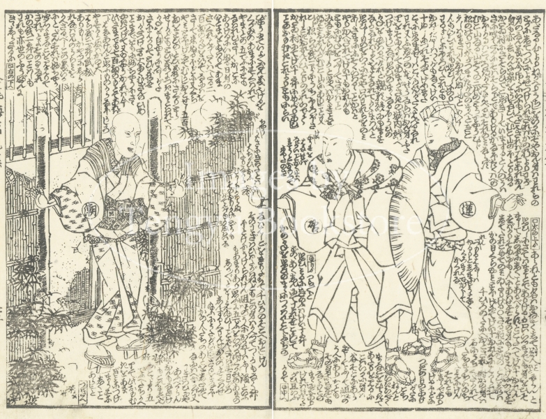 中国四大奇書の一つ「金瓶梅」を翻案した絵入草双紙である本作の挿絵は、浮世絵師としても知られる歌川国安(1794-1832)と歌川国貞(三代目歌川豊国/1786-1865)によるもの。